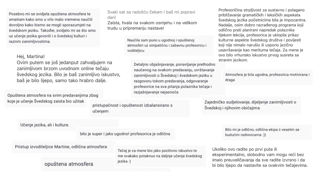 Ispod možeš pronaći dojmove drugih o ovome tečaju, kao i stvari koje navode da su im se posebno svidjele. Ovaj sam tečaj provodila već nekoliko puta – i u grupama s kojima sam radila uživo, i u grupama s kojima sam radila online – a cilj video tečaja isti je kao i cilj svih prethodnih: na zanimljiv i opušten način približiti ti švedski jezik i kulturu!